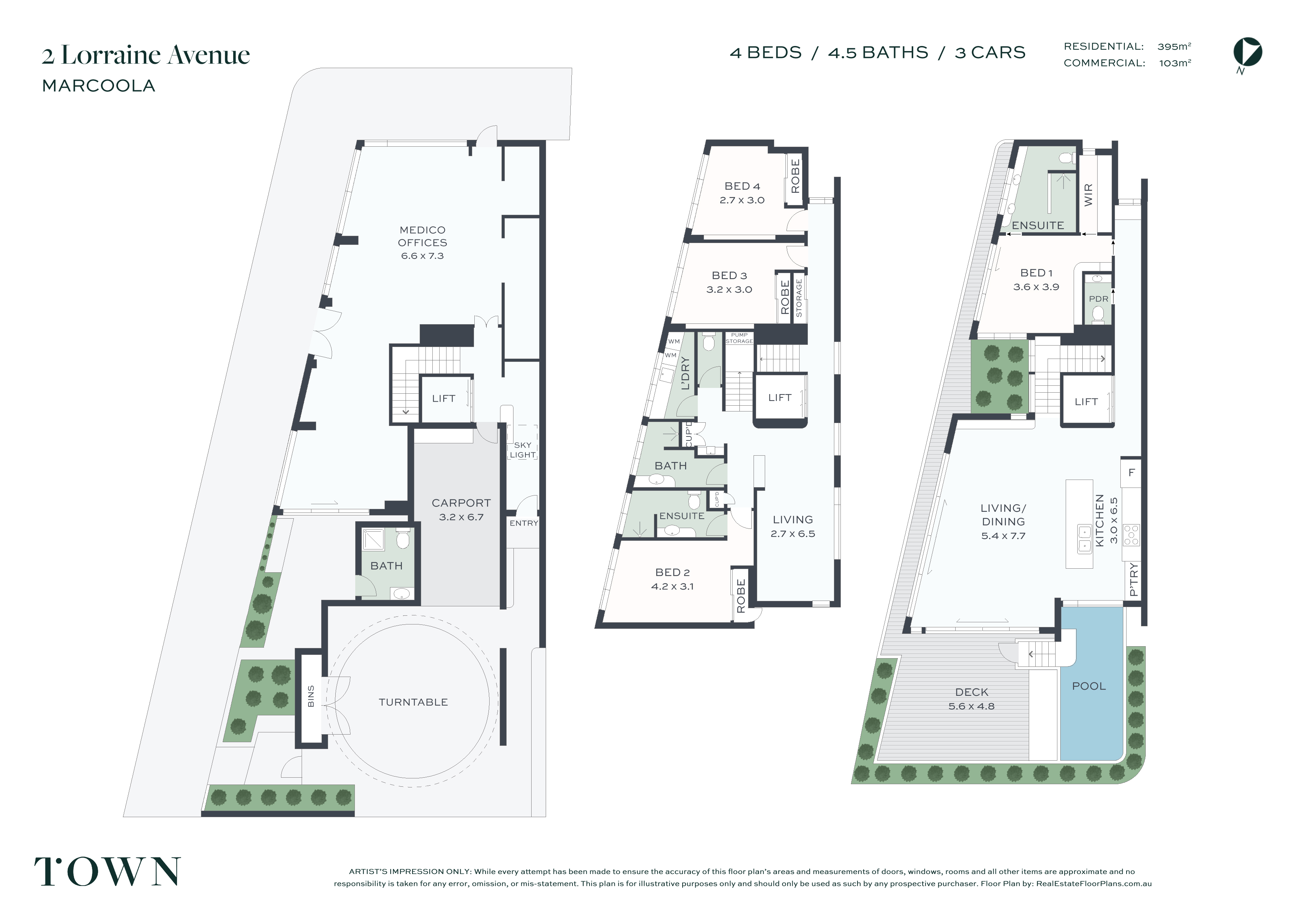 The residence which occupies the first and second floor; the first floor comprises three bedrooms, study, bathroom, powder room, rumpus, and laundry; with the master bedroom an ensuited master bedroom, powder room, premium kitchen, open plan living, rooftop garden, suspended (heated) pool with bridge to rooftop terrace on the second floor.