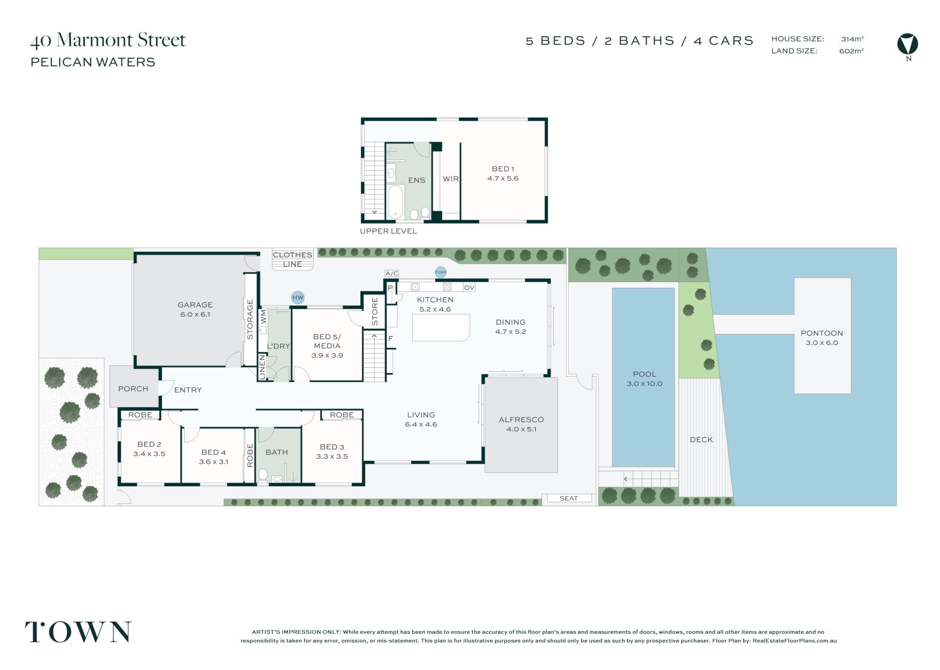 Across approximately 314 square metres on a landscaped 602m2 block, the residence comprises five bedrooms, two bathrooms, open plan living, sleek new designer kitchen, media room/5th bedroom, covered patio overlooking pool and showcasing sweeping water views, separate laundry, and double lock-up garage with extra storage.