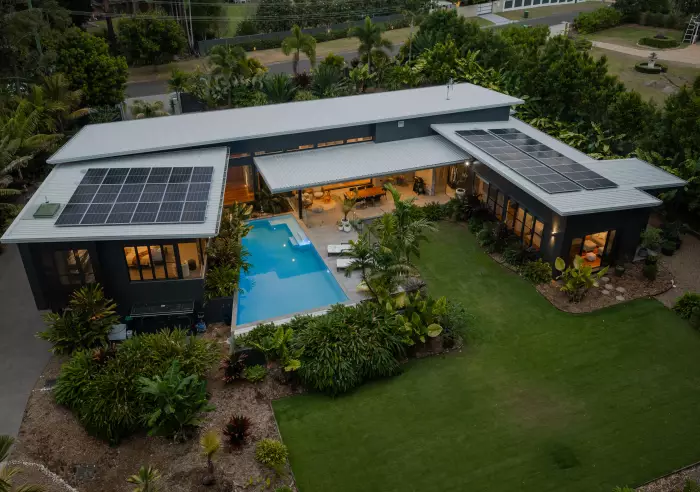 Among the extensive suite of features are tall ceilings (2.7m-3.56m), huge thermal treated windows, hand laid natural stone blade walls, ducted zoned air-conditioning, DC ceiling fans, solid NSW spotted gum flooring, wool carpets, ducted vacuum, smart-controlled security system, Bezzoni tapware, Mount Blanc stone benches, soft close cabinetry, gas strut servery window, Klipsch speakers, outdoor shower, 2 x hot water systems, 3-phase power, and 19.4kW solar power.