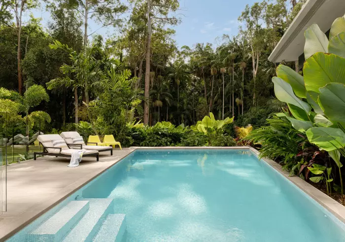 The inspired design balances connection with privacy, with a private parent’s wing elevated on the eastern side, enjoying picturesque outlooks over the pool, gardens, and rainforest. At the rear, a spacious guest suite offers flexible accommodation for visitors or extended family.