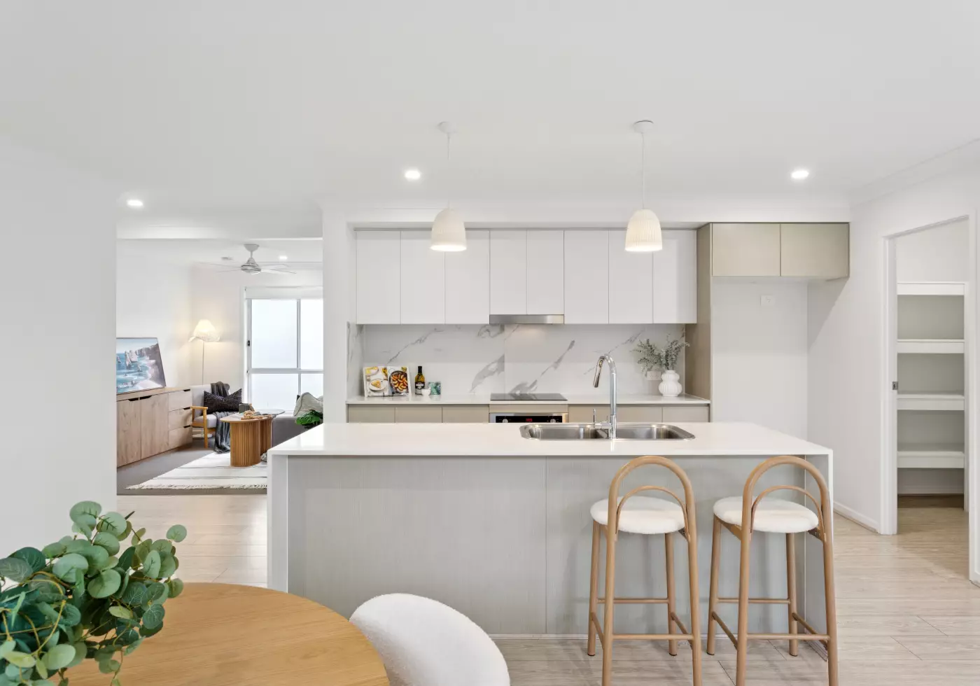 The kitchen is both stylish and practical, featuring stone benchtops, premium appliances, custom cabinetry, and a generous butler’s pantry - perfect for keeping everyday appliances tucked away. The main living zone is enhanced by abundant windows and sliding doors, inviting natural light within and making the most of the indoor-outdoor connection.