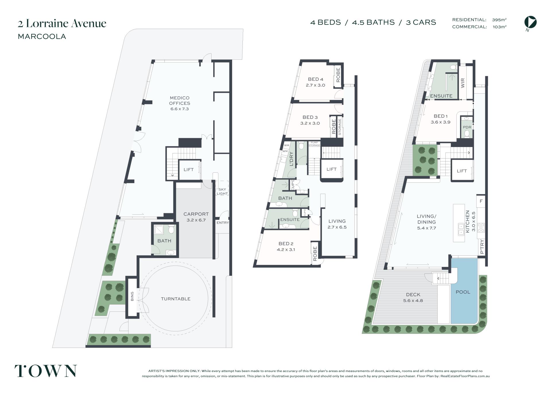 The ground level is currently utilised as a medical suites with internal and external seating areas, single carport and turntable for delivery vehicles; this premises is currently returning $80,000 per annum. There is also a lobby with a lift to access the dual-level residence above.