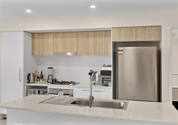 - Sophisticated kitchen with floating stone benchtop + SMEG gas cooktop