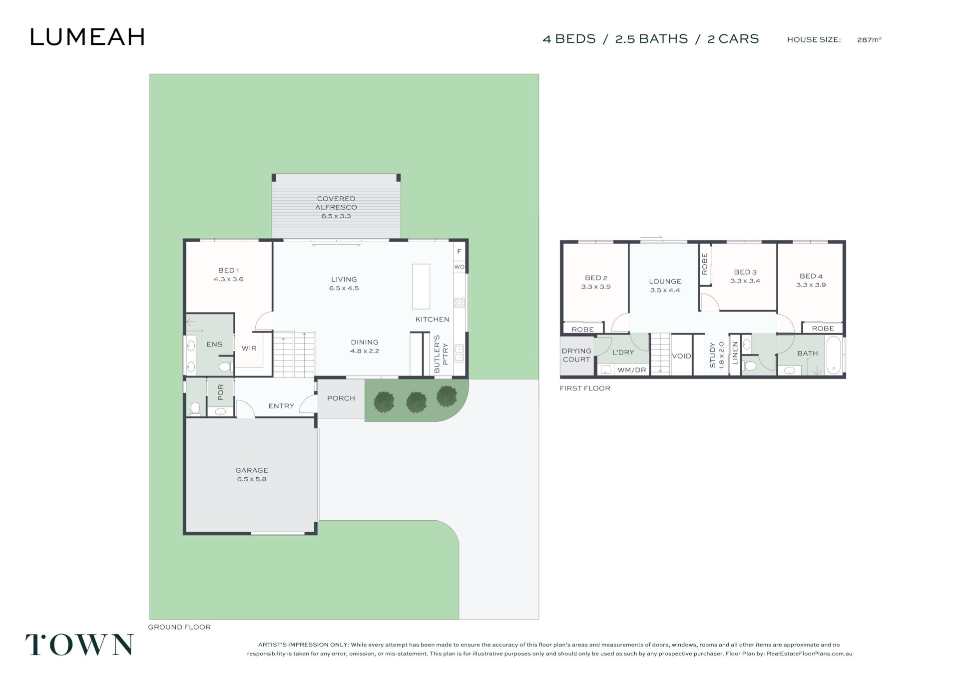 Spanning approximately 287m² across two levels, the home offers four bedrooms, 2.5 bathrooms, two separate living areas, a gourmet kitchen with butler’s pantry, covered alfresco for entertaining, a study nook, upstairs lounge, laundry and a double lock-up garage. The ground-floor master suite features a walk-in robe and ensuite for convenient family living.
