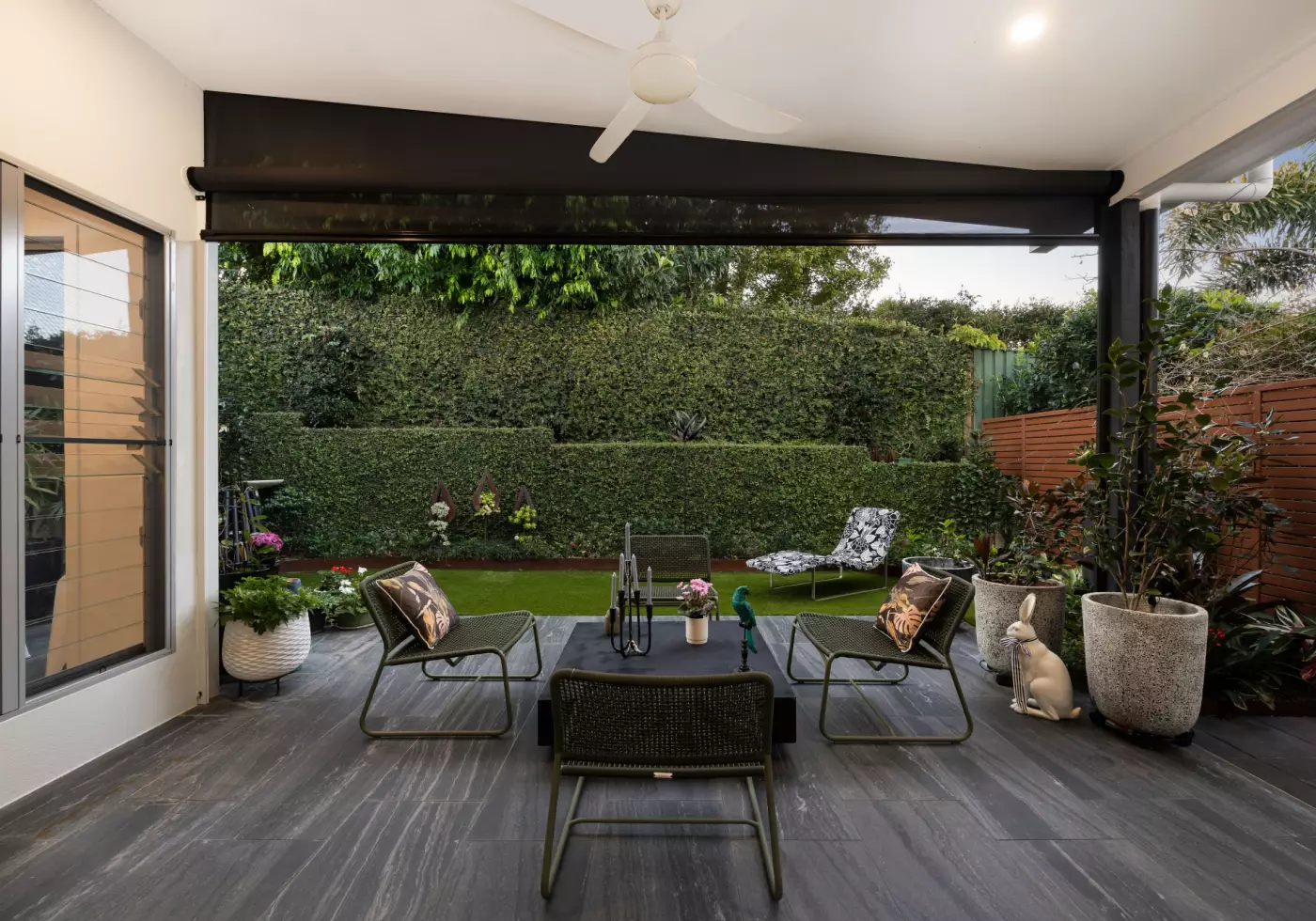 - Rear covered patio with pull-down blinds for year-round entertaining