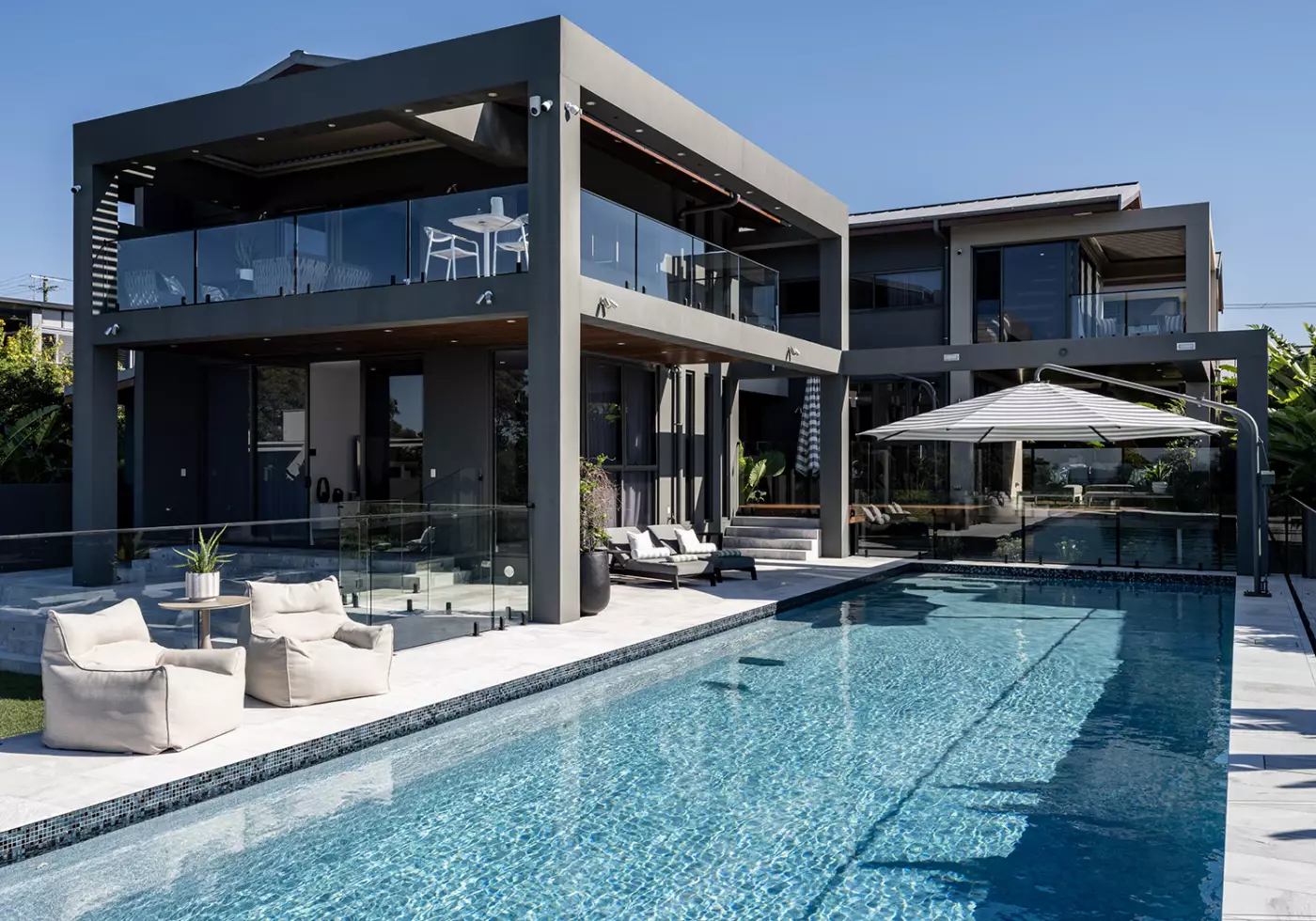 Indoor-outdoor living and wellness are central to the design. A 20m x 5m magnesium pool with outdoor infrared sauna creates a holistic wellness retreat, complemented by immense year-round alfresco entertaining areas that overlook the pool. Generous decks, a dedicated BBQ zone, and multiple open-air living and entertaining spaces ensure effortless gatherings. On the lower level, a private guest suite enjoys tranquil tropical garden outlooks, offering the ultimate in comfort and seclusion.