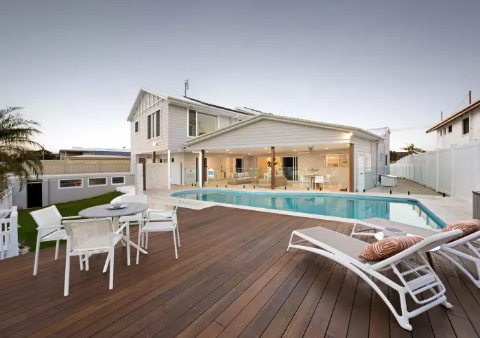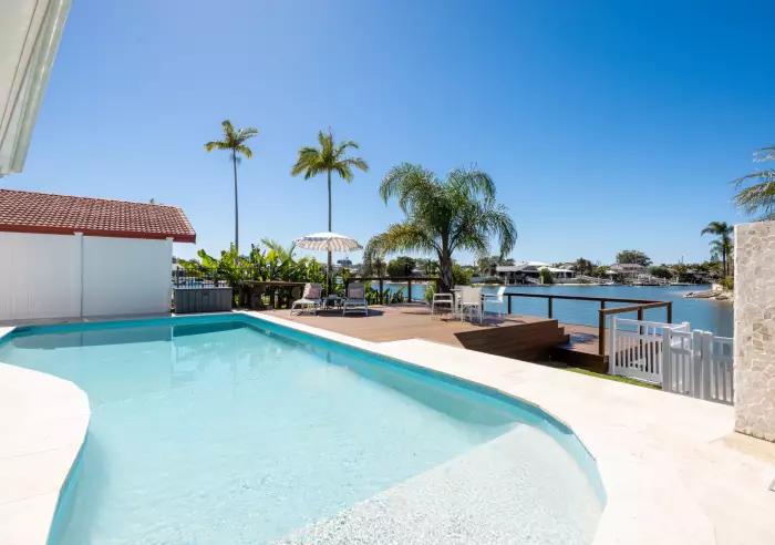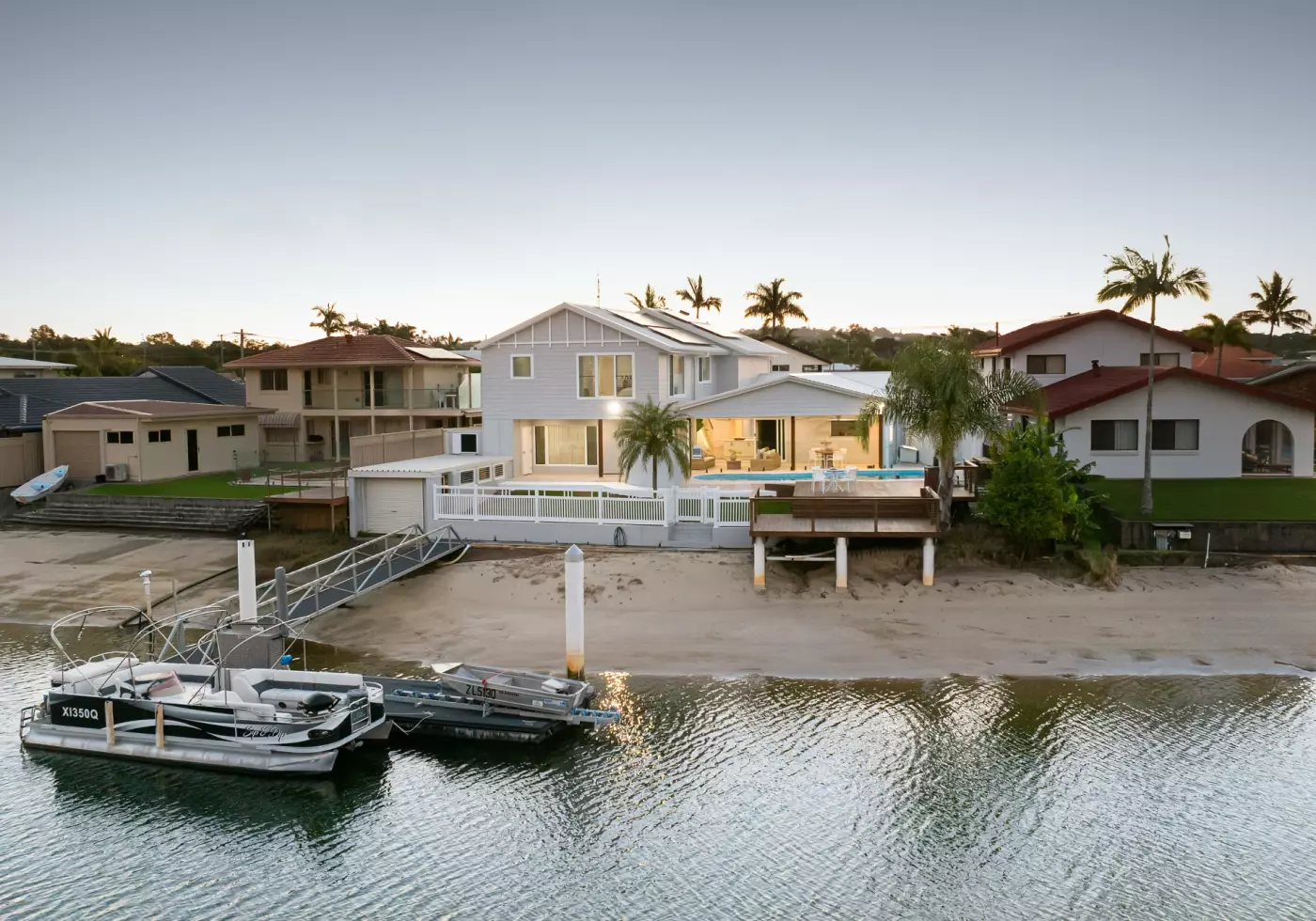This impeccably presented, light-filled riverfront residence on a huge 816m2 fully fenced block with wide 24.8-metre water frontage, exclusive sandy beach, powered pontoon, boat house, sundrenched pool, expansive alfresco decking, and a prized north-easterly aspect; offers a desirable coastal lifestyle of the very highest calibre.