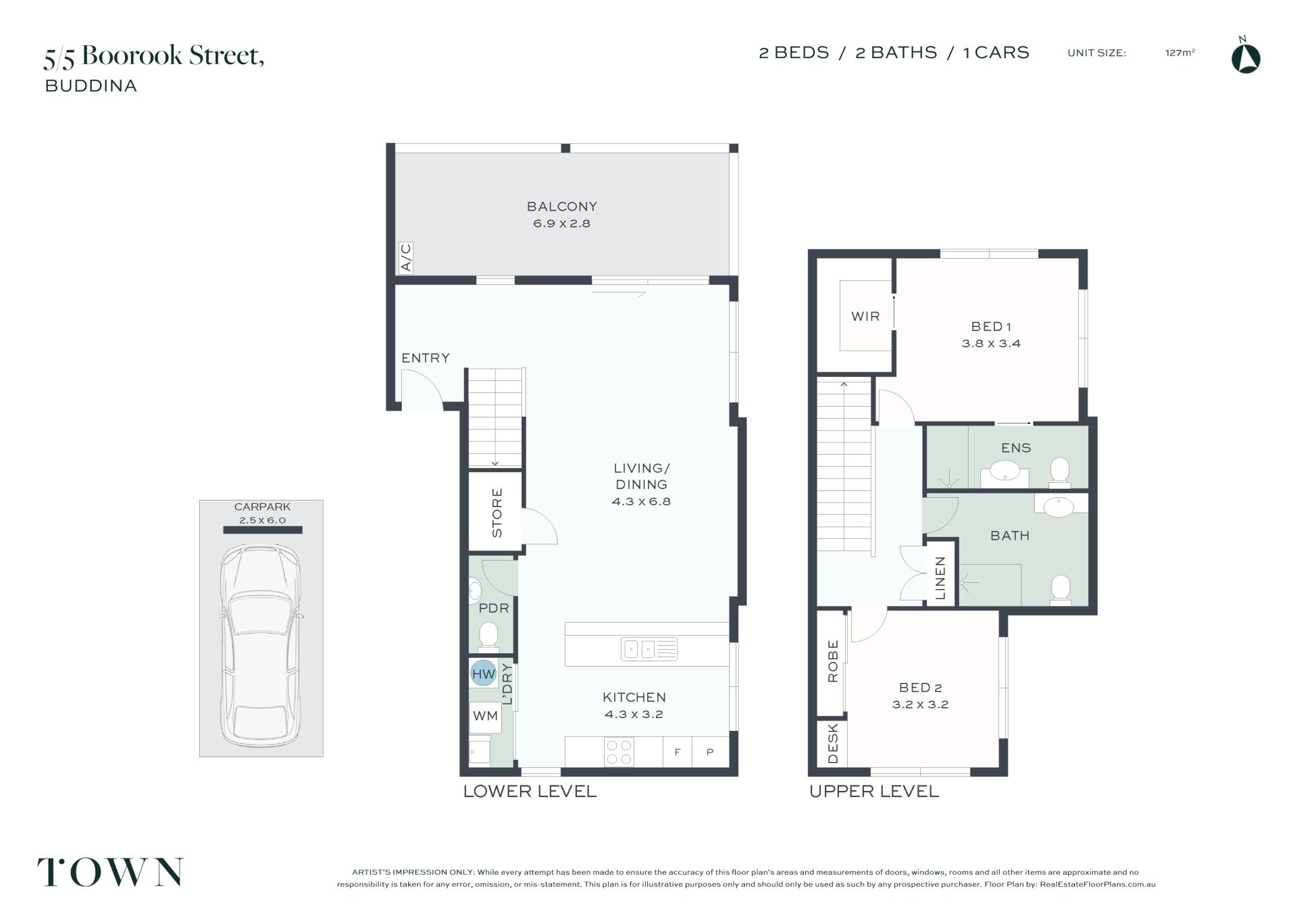 - 2 bedrooms, 2 bathrooms, 1 powder room, 1 secure car space