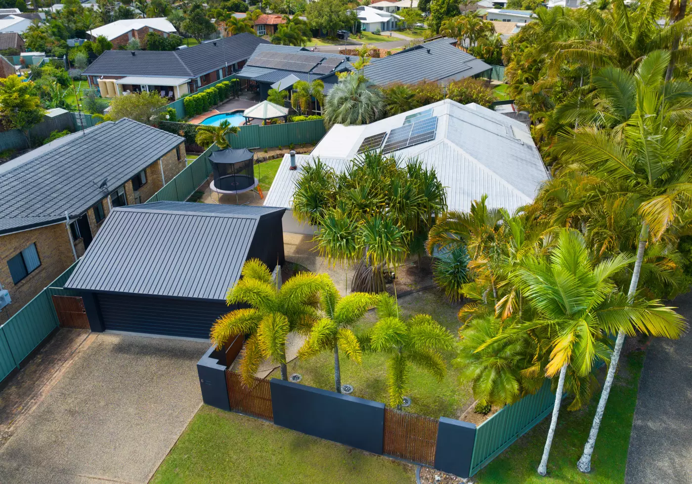 The front yard, framed by established palms and Pandanus trees, is anchored by a stylish sandstone entry wall that sets the scene for a home where modern finishes meet tropical accents. Inside the layout balances style and comfort with thoughtful separation between living and bedroom zones.