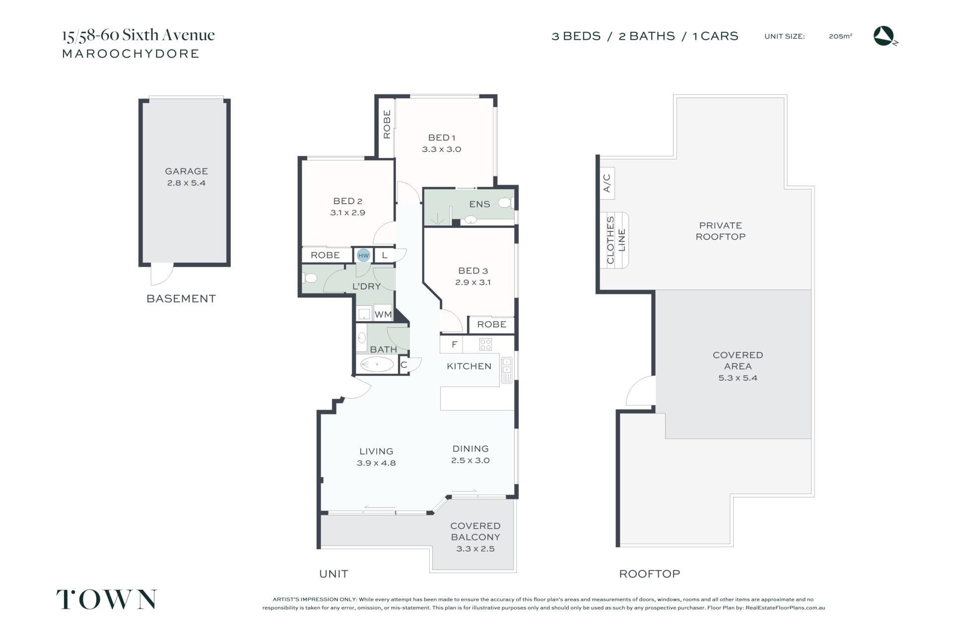 Comprising three bedrooms, two bathrooms, fully equipped kitchen, light-filled open plan living and dining flowing out to covered balcony, 205 m2 rooftop terrace, laundry facilities, and secure garage parking for one vehicle, it’s the perfect size for a couple and small family.