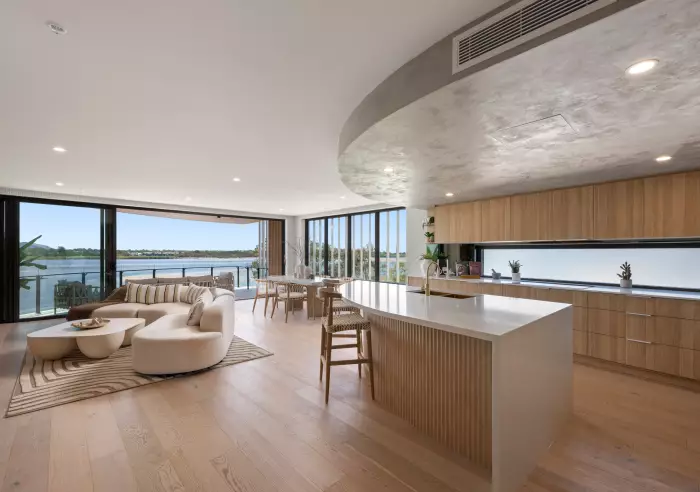 High ceilings, ducted air-conditioning, ceiling fans, engineered oak flooring and wool carpets, stone benches, Smeg appliances, soft close cabinetry, dual vanities in ensuite along with standalone bathtub, brushed brass tapware, wet bar in main living, direct access to the rear balcony from media room and second bedroom, and elegant modern coastal décor – are among the suite of notable features.