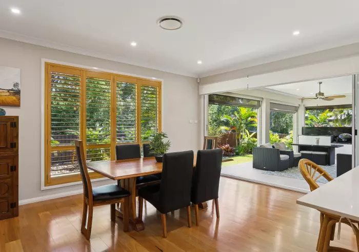 From the moment you step inside, the quality is undeniable. Hardwood flooring, plantation shutters, and high ceilings set the tone for sophisticated comfort, while ducted air-conditioning and solar power ensure efficiency and year-round comfort. The well-appointed kitchen features a waterfall-edge island bench, premium appliances, gas cooking, and extensive storage, while offering seamless flow to the adjoining living, dining, and alfresco spaces — designed for effortless entertaining and relaxed family living.