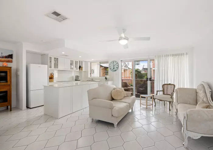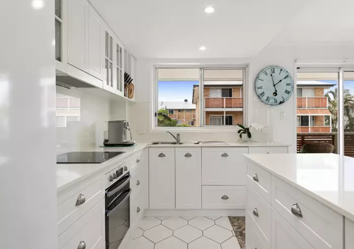 Set within a quiet, boutique complex, the home feels private yet effortlessly connected. The main living area flows seamlessly from the kitchen through to the balcony — a welcoming space that’s just as suited to lazy Sunday mornings as it is to entertaining friends at sunset. The kitchen combines form and function with modern appliances, generous storage, and a timeless coastal finish.