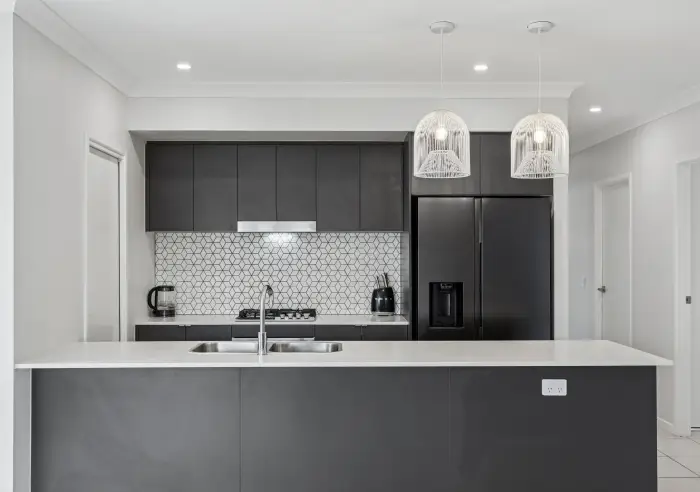 - Well-appointed kitchen featuring stone benchtops, quality appliances, breakfast bar, walk-in pantry
