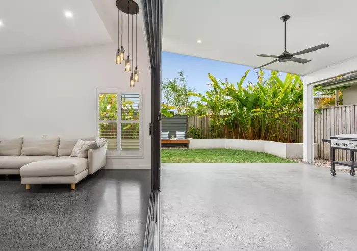 High, raked ceilings and polished concrete floors set a sophisticated tone throughout the light-filled open-plan living and dining space, which flows to a covered alfresco area complete with built-in bar — ideal for effortless entertaining year-round. A second living space provides valuable flexibility for families, while the stylish kitchen features stone benchtops, sleek cabinetry, abundant storage and a 900mm electric oven with gas cooktop.