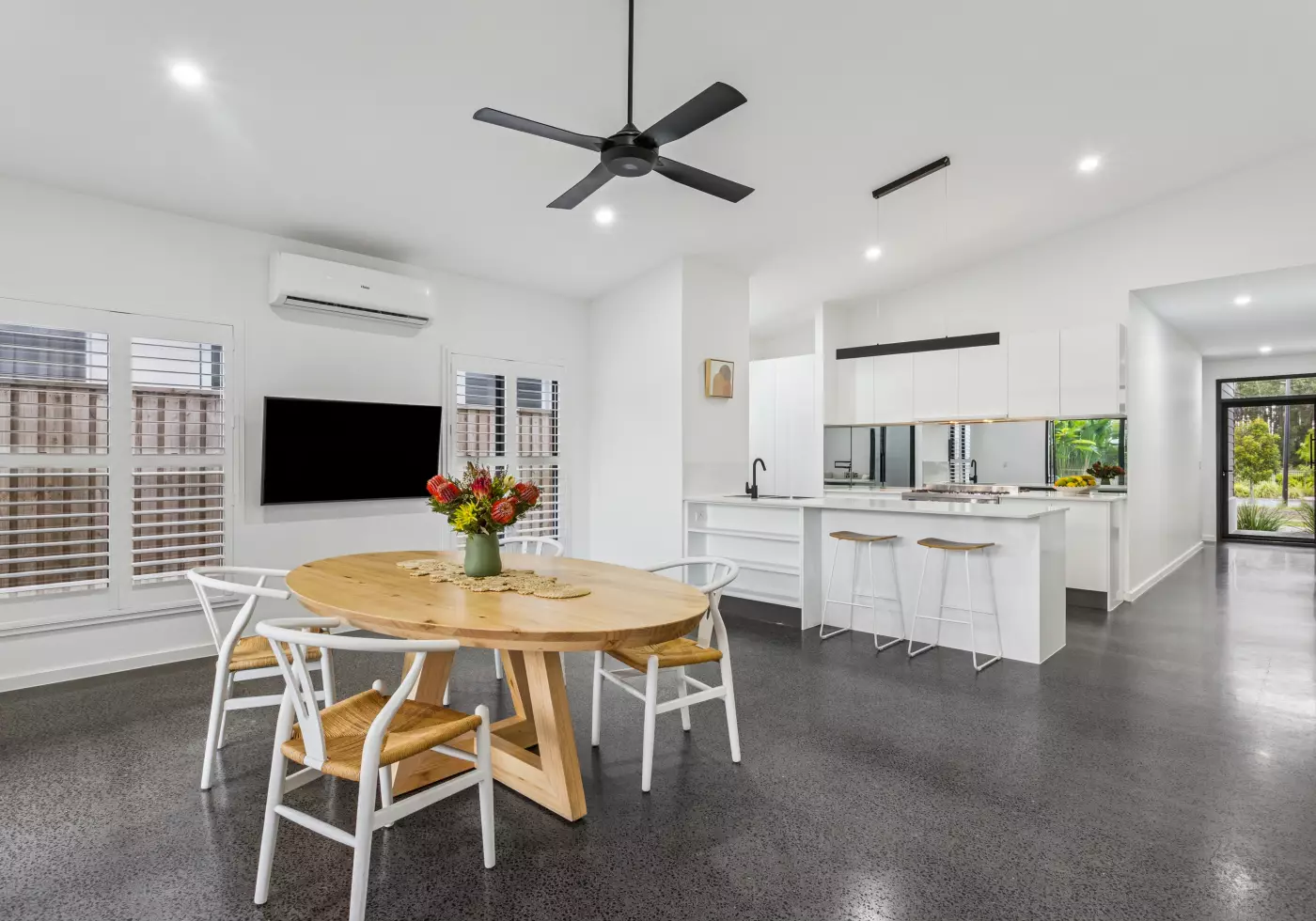 - Open plan living, raked ceilings, polished concrete floors, air conditioning