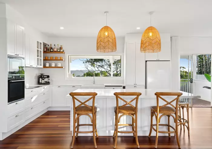 At the heart of the home lies a designer kitchen of timeless elegance, featuring shaker-style cabinetry, stone benchtops and high-end appliances. Perfectly designed for both everyday living and effortless entertaining, the open-plan living and dining spaces flow seamlessly to the wide verandahs and lush landscaped surrounds. The connection between indoors and outdoors is effortless — ideal for relaxed family gatherings or hosting guests beneath the stars.