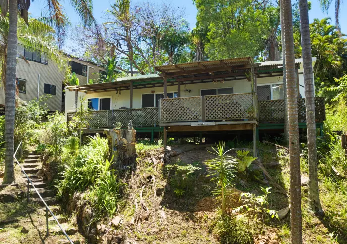 The existing four-bedroom shack sits high on a large terraced block of 974m2, featuring skillion roof design, large front deck and surrounded by tranquil bushland, delivering lush treetop views and a feeling of relaxed tranquility.
