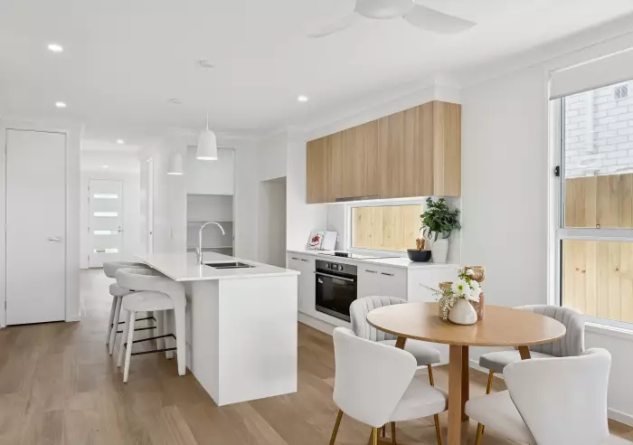 - Light-filled open-plan living with high ceilings and timber-look flooring
