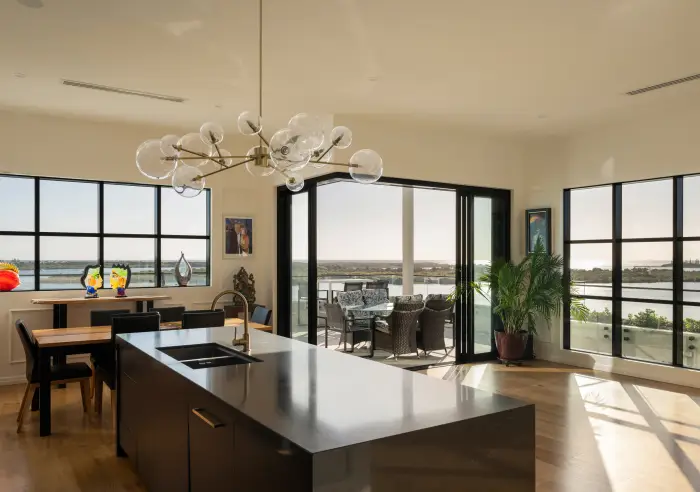Watch the shipping containers sail along the ocean, observe the plethora of fishing boats gently bobbing on the river, the paddleboarders and kayakers getting their daily exercise, and toast the good life in your gorgeous spa at twilight as the coastal lights shimmer and sparkle across the river; this view is arguably among the finest showcased anywhere along this coveted strip.