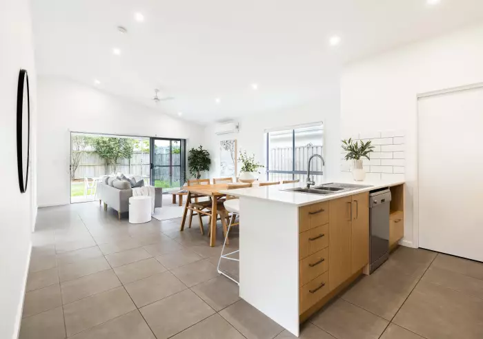 Light-filled interiors, vaulted ceilings and split-system air-conditioning in the living/dining, ceiling fans, LED lights, stone benches in kitchen and bathrooms, stainless steel appliances, gas cooktop, separate shower and bathtub in main bathroom, roller blinds, and gated pedestrian access, are some of the features that enhance value, comfort, and appeal.