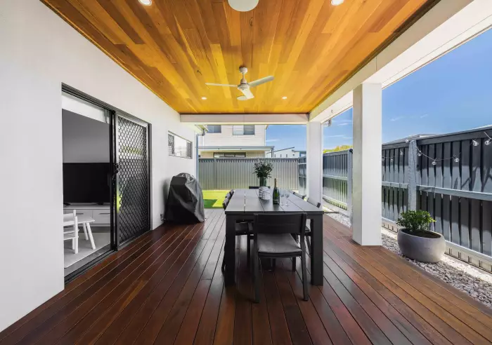 - Private covered deck with timber lined ceiling & fan