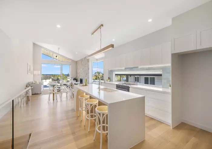 Upstairs, the open-plan living space delivers a true wow factor. Dramatic raked ceilings and expansive glazing bathe the area in light while framing the impressive ocean outlook. A beautiful stone feature wall and timber flooring further enhance the home’s sense of sophistication and comfort.