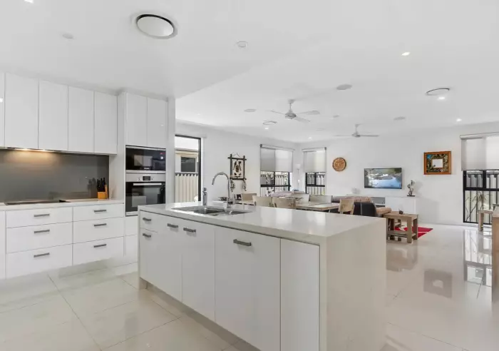 High ceilings and spacious open-plan interiors flow to a private, covered alfresco. Tiled throughout and finished with 40 mm stone waterfall bench tops, it delivers comfort, quality and easy living.