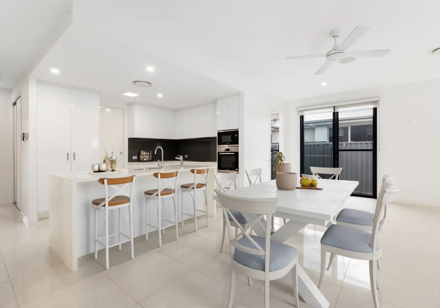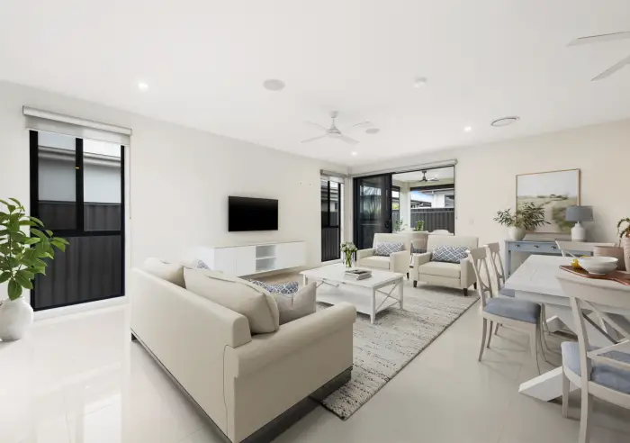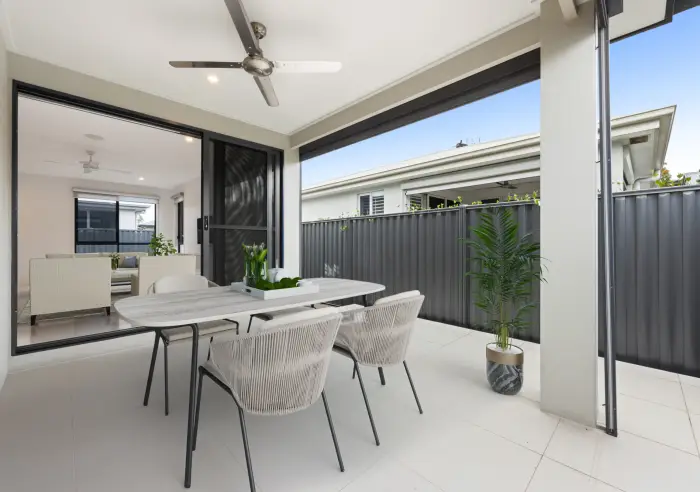 High ceilings and spacious open-plan interiors flow to a private, covered alfresco. Tiled throughout and finished with 40 mm stone waterfall bench tops, it pairs comfort and quality with private, relaxed living.