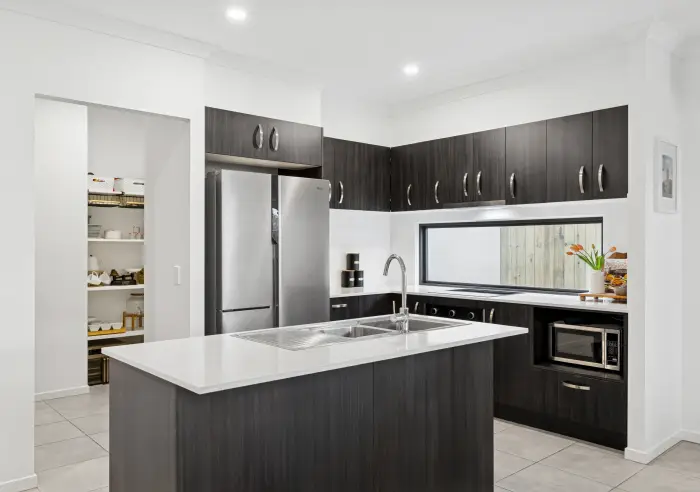- Functional kitchen with stone benchtops, island bench, garden window + walk-in pantry