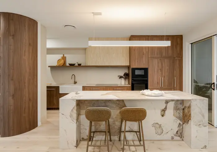 Inside, the home unfolds into light filled living spaces finished to an exacting standard, where a soft neutral palette, natural textures and beach inspired styling create a relaxed yet refined atmosphere. The open plan living and dining area is designed for both everyday comfort and effortless entertaining, flowing seamlessly through wide sliding doors to a spacious covered terrace, while the kitchen is beautifully appointed with eye catching timber cabinetry, a striking marble stone island with breakfast bar, farmhouse style sink, premium appliances, industrial pendant lighting and a bespoke butler’s pantry, all thoughtfully curated to suit the sublime coastal surrounds.