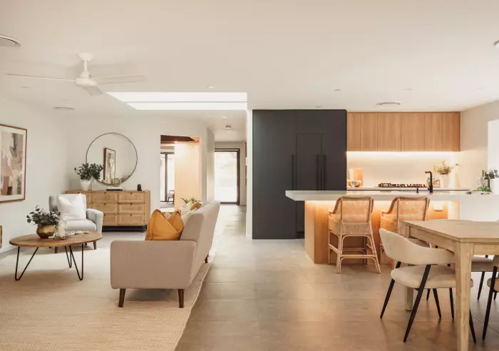 Beyond the welcoming entry, stylish contemporary interiors reveal a series of light-filled living spaces enhanced by bespoke finishes and an intuitive flow between indoors and out. Immense glass sliding doors frame leafy outlooks at every turn, drawing in natural light and gentle breezes while creating a seamless connection to the outdoors—ideal for both everyday living and hosting on any scale.