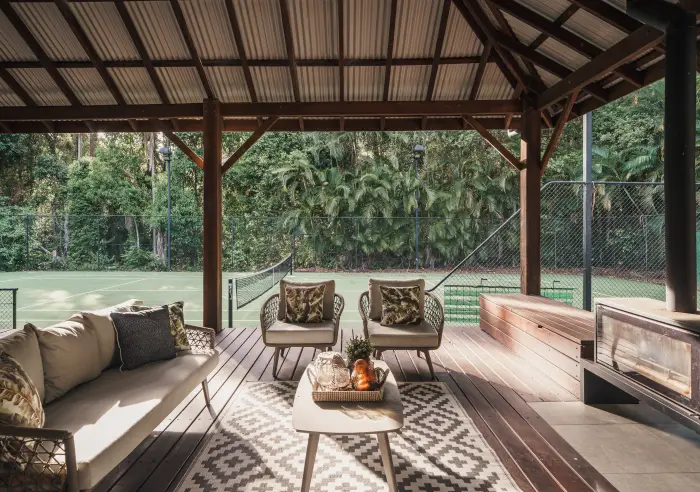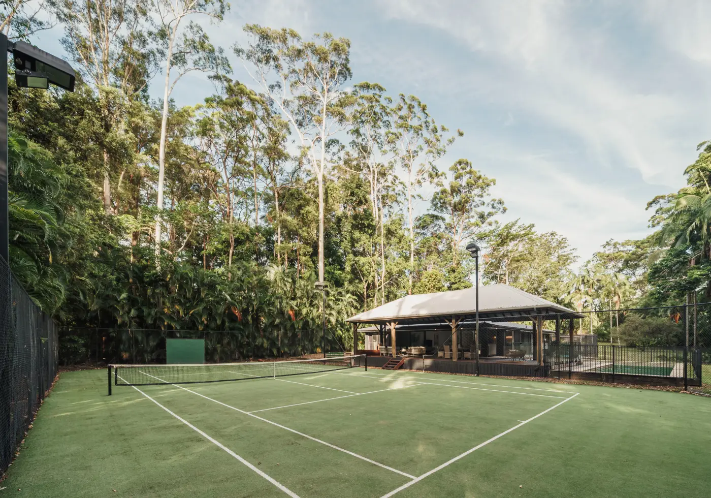 Designed with entertaining in mind, the enormous outdoor pavilion is a standout feature—boasting hardwood decking, a cosy fireplace, and uninterrupted views across the full-sized floodlit tennis court and sparkling in-ground pool. This is a setting perfectly suited to year-round gatherings, long lunches, evening fireside conversations, or simply unwinding while immersed in the surrounding rainforest serenity.