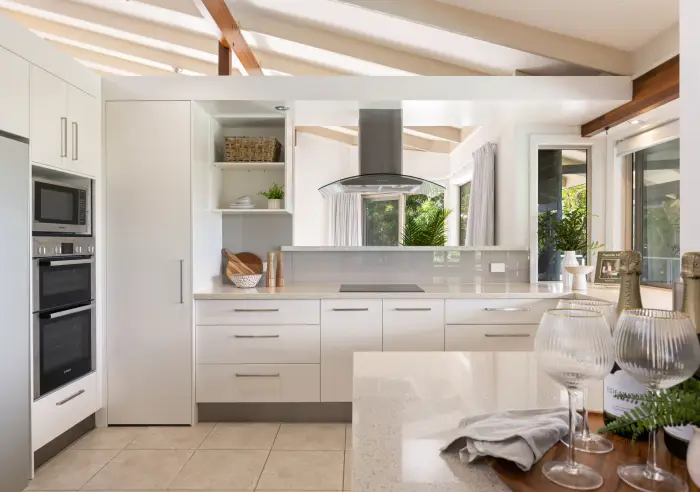 - Kitchen with Caesarstone benchtops, 2-pac cabinetry, Bosch double ovens and induction cooktop