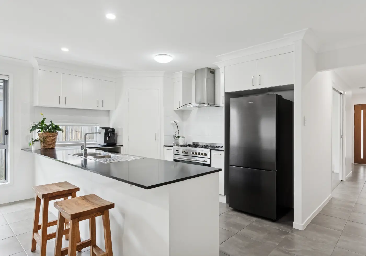 At the centre of the home, open-plan living brings together the kitchen, dining and lounge in a bright, welcoming space that opens out to a covered alfresco perfectly suited to quiet morning coffees, family dinners or weekend gatherings with friends. High ceilings and generous glazing encourage natural light and cooling breezes to circulate throughout, while a separate media room sits just apart, offering a peaceful retreat for family movie nights or a quiet place to relax and unwind. The stylish kitchen combines stone benchtops, a breakfast bar and premium appliances and offers seamless connection to both the indoor and outdoor dining areas.