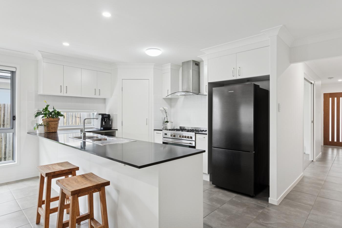 • Stone benchtops, breakfast bar, 900mm Euro oven and Haier dishwasher