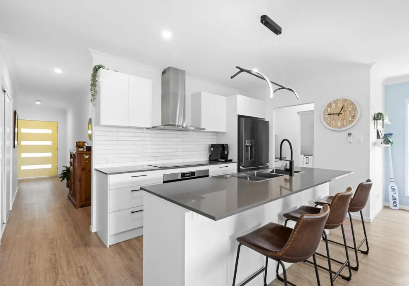 Landscaped surrounds and a covered entry provide a welcoming arrival, leading inside to neutral tones, pendant lighting and stone highlights that carry a warm, consistent style from room to room.