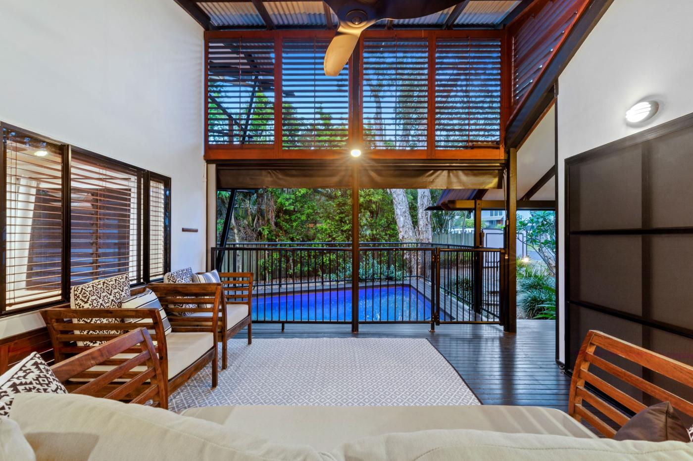 High ceilings, exposed beams and a functional open-plan kitchen, living and dining zone form the heart of the home, opening onto a versatile breezeway that connects beautifully with the outdoors. The integrated salt-water pool enhances the relaxed coastal aesthetic, framed by established trees, generous yard space and a wonderfully private setting.