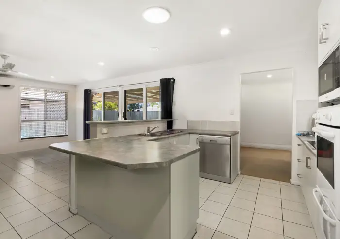Open-plan living flows to a covered alfresco and adjacent sun-lounge area, creating a simple indoor–outdoor rhythm that suits the Sunshine Coast lifestyle. Air conditioning to the master and main living keeps things comfortable year-round, while the spacious kitchen delivers the bench space families actually need.