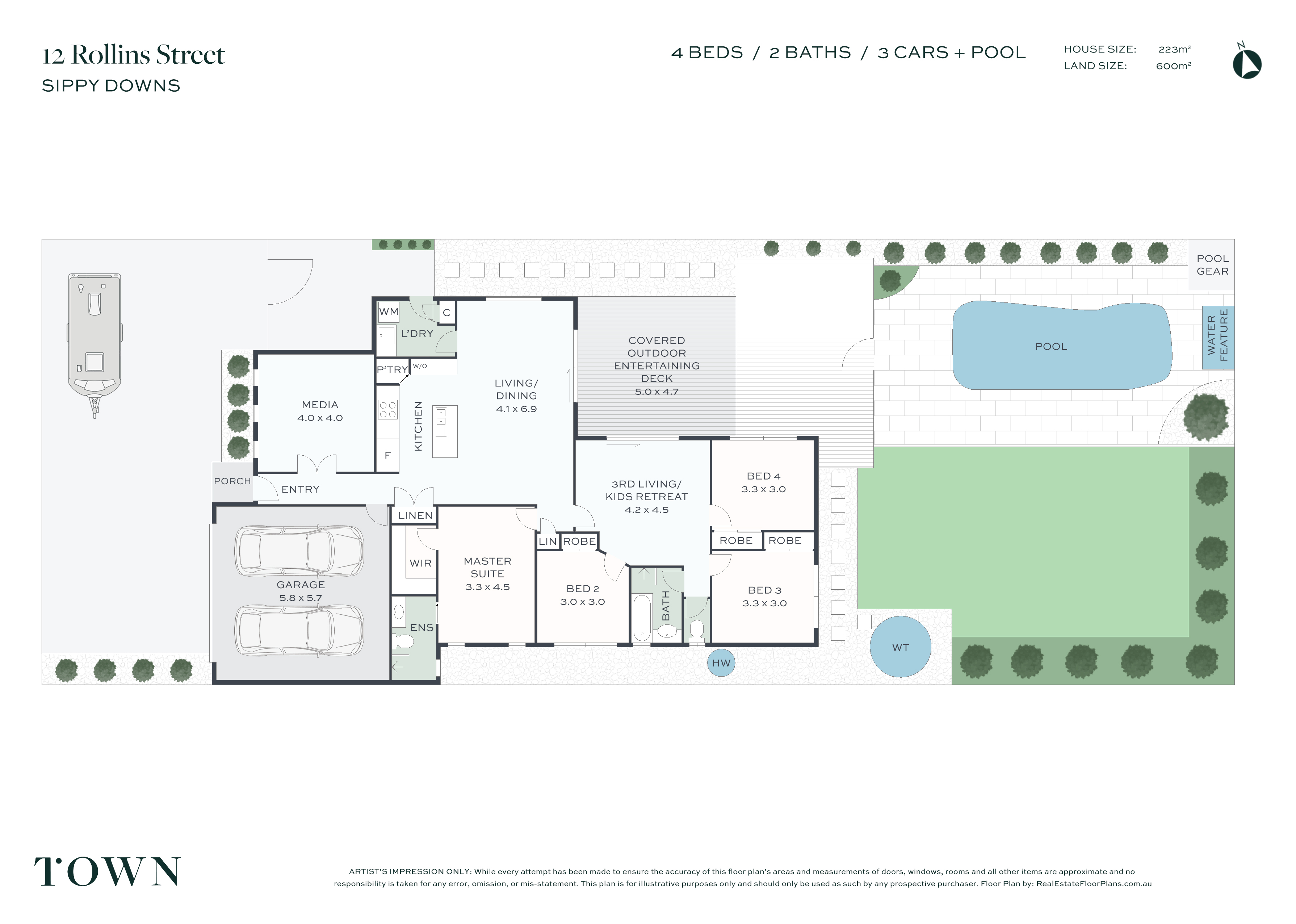 Across a single level the home comprises four bedrooms, two bathrooms, media room, open plan living/dining, children’s retreat, central kitchen, covered deck, separate laundry with external access, and double lock-up garage; there is also extra parking for two vehicles/access for a trailer.