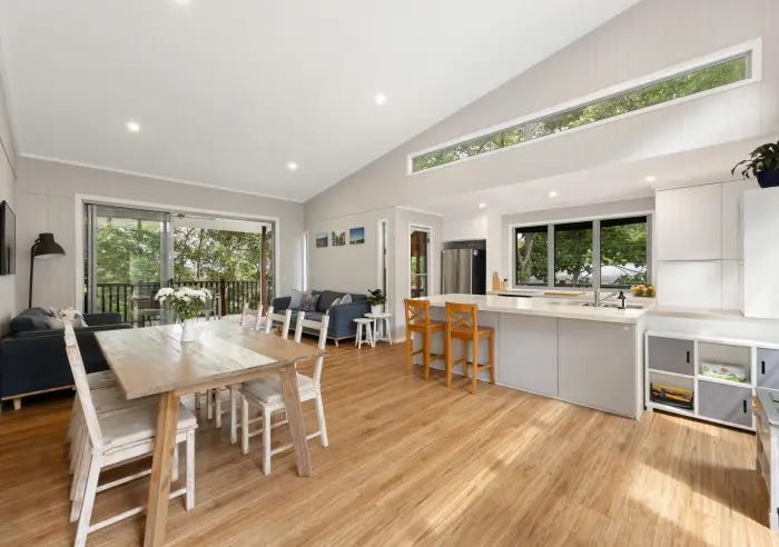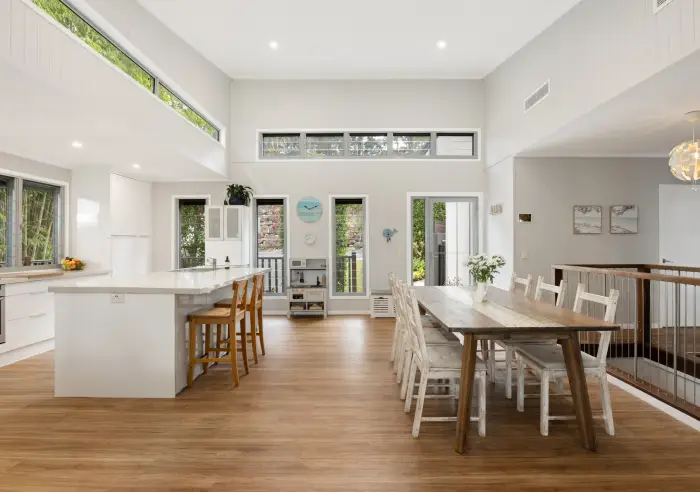 Upstairs, open-plan living and dining flows seamlessly to a generous wraparound covered deck, perfectly positioned for entertaining or simply unwinding while enjoying the tranquil outlook. The designer kitchen features a substantial stone island bench, quality appliances and abundant storage, all framed by high raked ceilings and VJ panelling that add warmth and architectural character. The master suite enjoys privacy, complete with walk-in robe, ensuite and elevated hinterland views.
