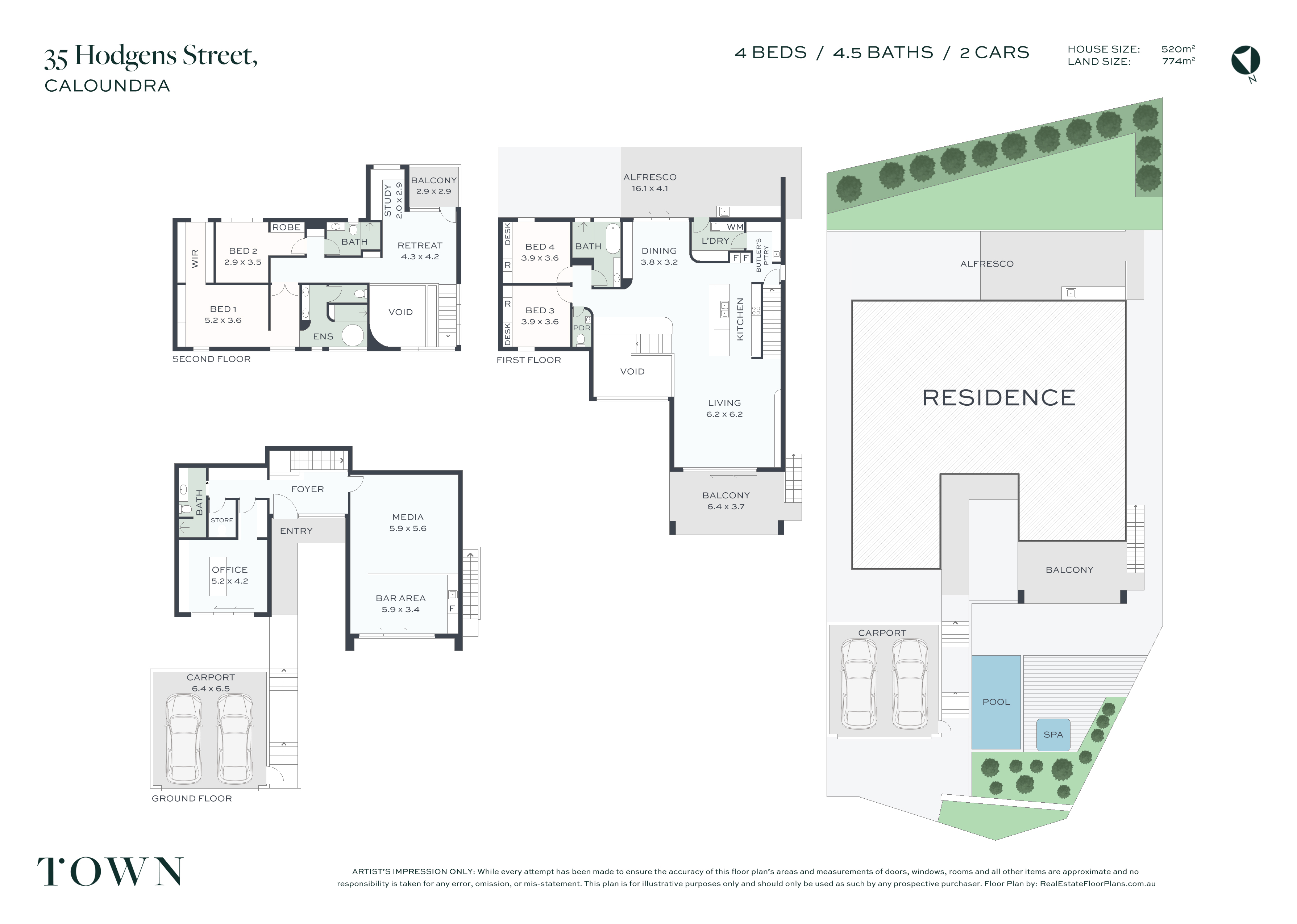 Across approximately 520 square metres, the home comprises a grand formal entry, four bedrooms, four luxe bathrooms plus powder room, office with external entry, sleek galley kitchen with double-height void and butler’s pantry, open plan living flowing to north facing balcony with elevated outlook, dining flowing to private rear alfresco terrace, fully equipped cinema with dedicated bar area, study nook, exclusive upper retreat with balcony, laundry, and double-lock up garage.