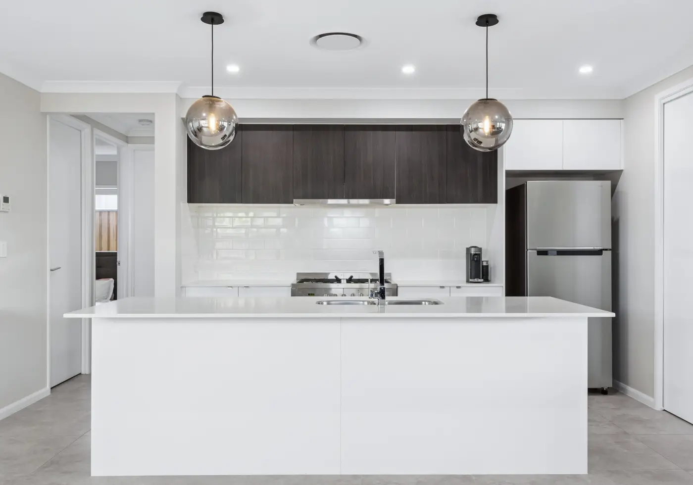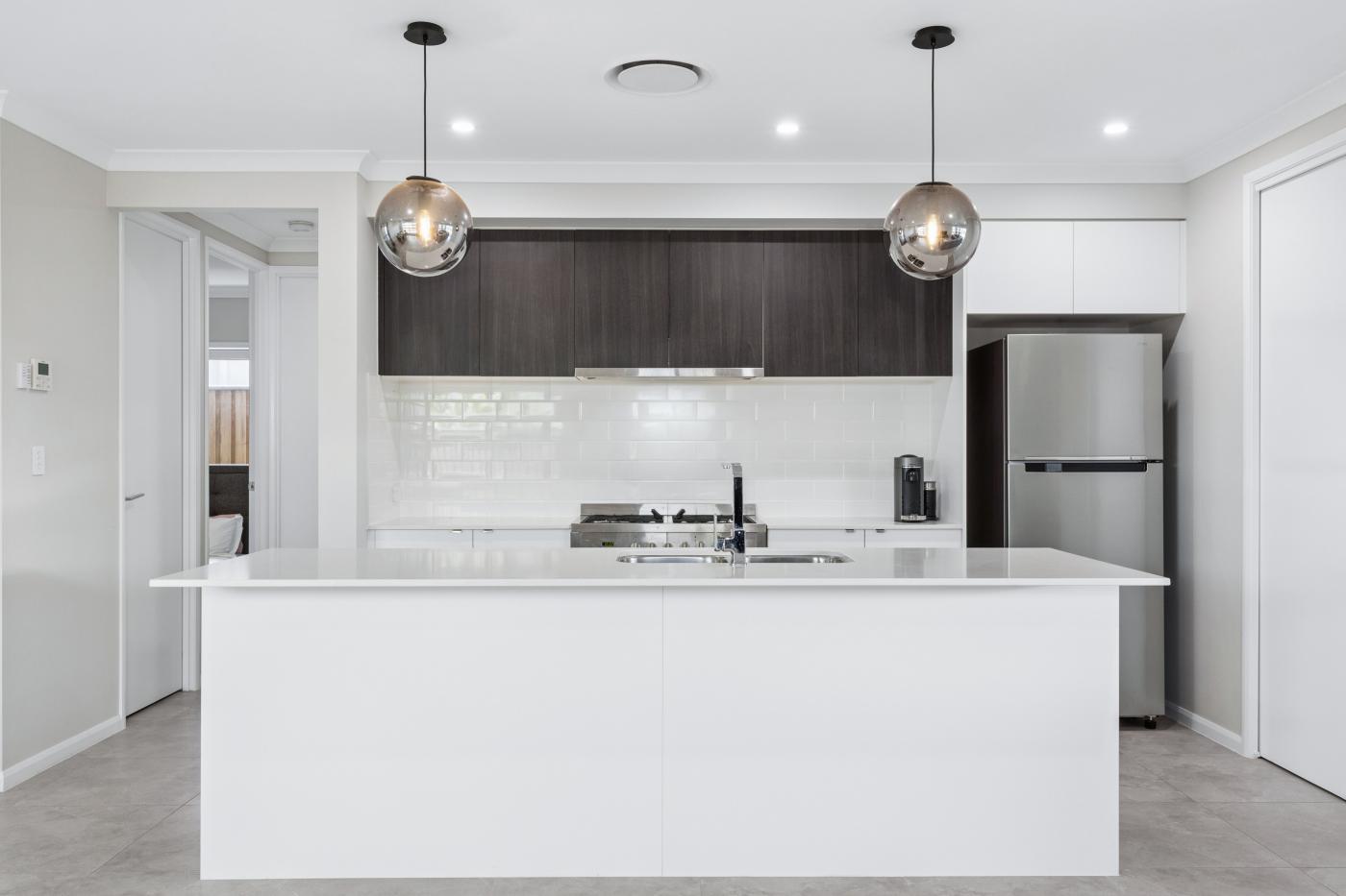 The kitchen combines contemporary design with practical detail, finished with 20mm Caesarstone benchtops, quality cabinetry and a walk-in pantry that allows appliances to remain neatly out of sight. A 900mm oven with gas cooker anchors the space, while generous bench areas and considered storage ensure the kitchen remains both functional and visually refined.