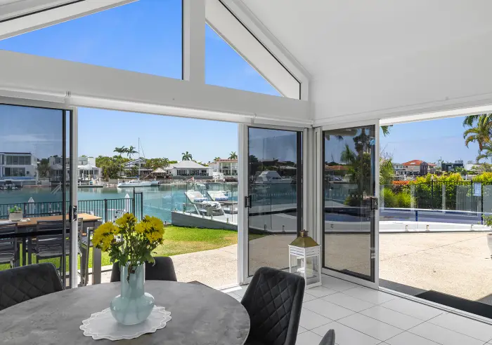 Inside, light-filled interiors are enhanced by raked ceilings, plantation shutters, stone benchtops, quality flooring and soft-close cabinetry. Additional highlights include high quality stainless-steel appliances, split-system air-conditioning, ceiling fans, solar power, abundant storage, and a 7 x 3 m pontoon with exclusive sandy beach—perfect for boating enthusiasts seeking quick, unrestricted ocean access in a private setting with no passing traffic or wash to deal with. By day, the outlook over the water is serene and sunlit; by night, it transforms into a dazzling panorama of shimmering water and lights. Return home from a day out on the water, moor the boat at your private pontoon, and unwind with sunset drinks as the river reflects the evening glow.